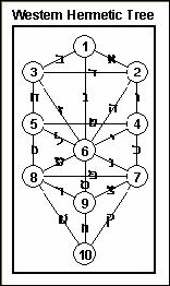 (Western Tree) (= Kether, Sephirah 1) (= Chokmah, Sephirah 2) (= Binah, Sephirah 3) (= Gedulah, Sephirah 4) (= Geburah, Sephirah 5) (= Tiphareth, Sephirah 6) (= Netzach, Sephirah 7) (= Hod, Sephirah 8) (= Yesod, Sephirah 9) (= Malkuth, Sephirah 10) (= Aleph, 1>2) (= Beth, 1>3) (= Gimel, 1>6) (= Daleth, 2>3) (= Heh, 2>6) (= Vav, 2>4) (= Zayin, 3>6) (= Cheth, 3>5) (= Teth, 4>5)