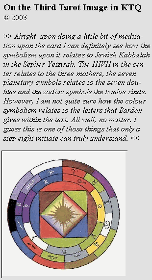 #2) The outer wheel represents the Akashic essential meaning or "legality" (Earth pole) as expressed through the 10 Sephirot and the numbers 1 thru 10. The zodiacal wheel represents those Letters that have a special affinity for the mental realm. The planetary wheel represents those Letters that have a special affinity for the astral realm (the "seven portals to the soul"). The inner square of the Elements represents the physical realm.