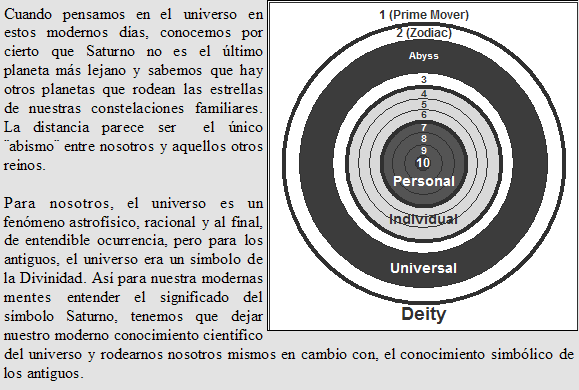La dualidad implicada por estos nombres nos conectan a atrás a la concepción más temprana del cosmos el cual coloca el personal-Saturno en el cercano lado del abismo--en cambio de colocar un universal-Saturno en lado lejos del abismo como lo hacen los Cabalistas. En la práctica, el abismo Binah/Saturno se extiende en ambos lados. La mas baja manifestación de Binah es solamente una apariencia, una oscura reflexión del Binah mas alto, pero ello es, sin embargo el que nos guía a través del abismo al mas alto Binah.