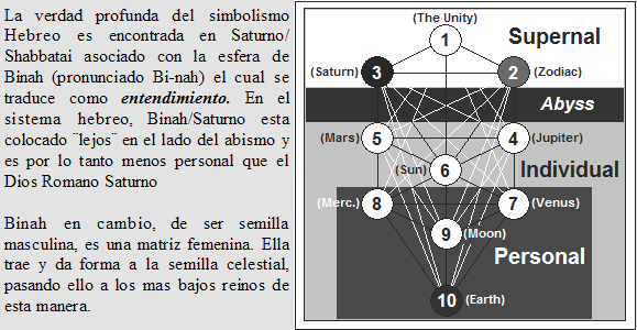 Aquí el aspecto masculino esta abarcado por el femenino. En otras palabras, Binah acarrea dentro de ella el mismo aspecto que vemos en el masculino Saturno/Cronos, pero ella pone aquellos aspectos dentro de un suave contexto diferente.
