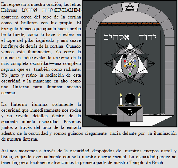 Empezar como es usual: pasar a través de la entrada de la caverna, a lo largo del túnel, subir los diez peldaños y dentro del Templo de Malkuth yo permanezco esperando la llegada de Uds.