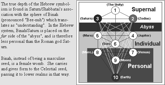 The duality implied by these titles connects us back to the earlier conception of the cosmos which places a personal-Saturn on the near side of the "abyss" -- instead of placing a universal-Saturn on the far side of the "abyss" as do the Qabbalists. In practice, Binah/Saturn straddles the "abyss" and exists on both of its sides. The lower manifestation of Binah is only an appearance, a dark reflection of the upper Binah, but it is, nonetheless, what leads us across the "abyss" to that higher Binah.