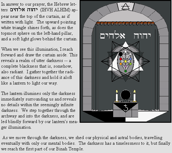 A dark realm surrounds the first part of our Binah Temple. The Temple itself sits right at the edge of a great, utterly black ocean. This ocean represents the abyss which we will symbolically cross.