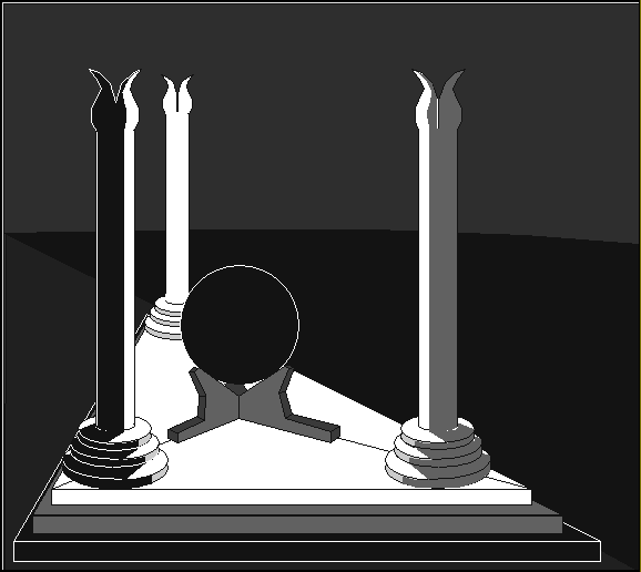 Our journey from the Malkuth Temple to the first part of our Binah Temple, will be a passage through utter darkness. The first part of the Binah Temple is constructed from very simple symbols. You will recognize three of the four pillars from the Gedulah Temple. One casts no shadow and is completely white; one casts a gray shadow; and one casts a black shadow. These three pillars stand upon a set of three triangular slabs: one black, one gray, and one white.