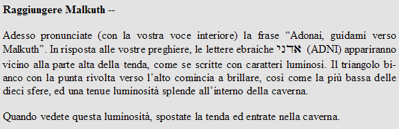 Raggiunta la cima delle scale, vi trovate nel tempio di Malkuth, con lo sguardo rivolto verso la sua parete orientale. Io mi trovo nel lato sud-orientale (avanti, a destra), in attesa del vostro arrivo. [Descrizione: sono alto un metro e 80, capelli rossi lunghi e mossi, una barba corta rosso-grigia. Indosserò una semplice veste bianca rituale, con una cintura blu e rossa, e, sopra a questa, una lunga veste rossa che arriva fino al terreno ].