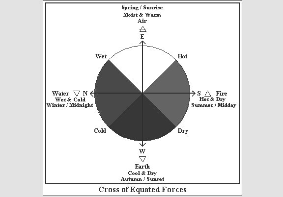 L'Aria è l'incontro e l'unione delle qualità opposte di Fuoco e Acqua. Si dice che combini il calore del Fuoco e l'umidità dell'Acqua, ma dire che l'Aria è "calda è umida" è un'esagerazione. Di fatto, l'Aria non è "calda", piuttosto non è "né calda né fredda". Poiché nell'Aria il caldo e il freddo (espansione e contrazione) si annullano a vicenda, il che risulta in una neutralità "temperata". Paragonata all'Acqua, l'Aria è calda, ma paragonata al Fuoco è fredda. Allo stesso modo, l'Aria non è "umida" di per sé, è piuttosto una via di mezzo tra l'Acqua che bagna e Fuoco il fuoco che asciuga.