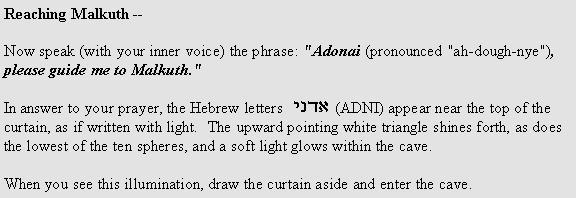 Since Malkuth is a symbolic space, our meditation will begin with a journey into the earth -- through a cave entrance and down a natural tunnel. This tunnel eventually leads to the Malkuth Temple.