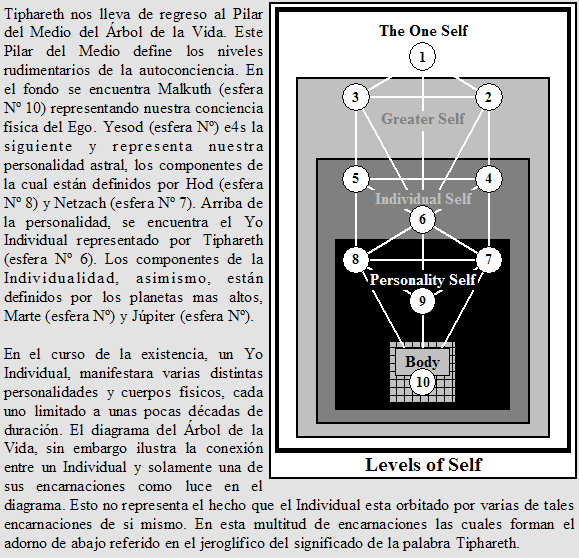 Como el Árbol de la Vida presenta, el Yo Individual en el cual contactamos ese influjo más alto directamente. Si buscamos directamente el influjo desde el nivel físico vemos y encontramos planos intermediarios del Yo que están entre ellos y nosotros mismos. Asimismo, este influjo mas alto debe pasar abajo a través de estos mismos planos intermediarios de expresión antes que alcancen el plano físico.
