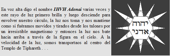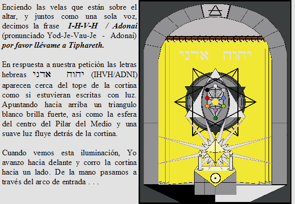 Para alcanzar Tiphareth, primero pasaremos de Malkuth a nuestro familiar Templo de Yesod, subiendo desde el físico a la personalidad. Luego desde Yesod, subiremos a Tiphareth. Esto es llamado subiendo los planos y es una forma de trabajar en las esferas, lo cual tiene un muy integrador efecto sobre la estructura interna del Ego.