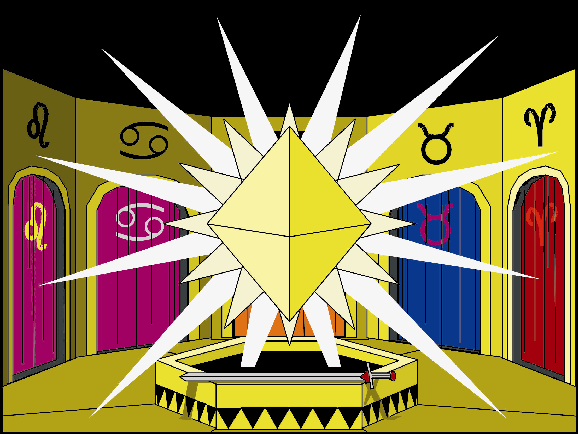 En el momento apropiado, Yo llevare nuestra atención al cuarto Este del altar, nuestra puerta de entrada a Tiphareth. Cubriendo y sobre el altar, vemos un gran diamante cortado el cual parece brillar con una profunda luz. Detrás de eso vemos la misma cortina con el símbolo que encontramos en la entrada de la caverna.