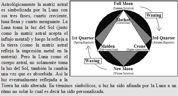 La Luna física representa una esencial resonancia (Yo no se otra forma de decirlo) con la personalidad humana y con la matriz astral de todas las cosas físicas. Sus fases y sus aspectos con los otros planetas afectan directamente nuestras vidas.