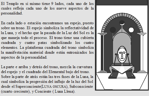 Ahí están las nueve caras de tu propia personalidad. Tómate un tiempo para investigar cada uno de los nueve espejos. Recomiendo que para tu primera experiencia en Yesod, trabajes en el sentido de las agujas del reloj alrededor del Templo y enfocado primeramente a identificar cada uno de estos aspectos de ti. Naturalmente estaras tentado a denegar ciertas partes de ti y abrazar a otras, pero urge evitar este tipo de juicios por el momento y adoptar una actitud mas objetiva. Puedes siempre retornar al Templo de Yesod y buscar una más completa auto-observación mas tarde. Por ahora, el objetivo es comenzar el proceso para aprender a reconocer las caras de tu personalidad.