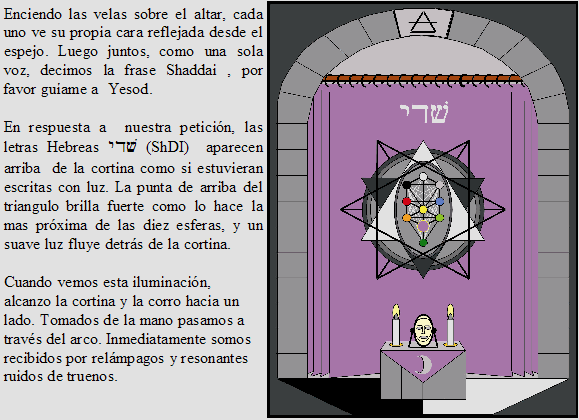 En el momento apropiado, traeré la atención sobre nosotros y entonces soltaremos las manos. Yo dirigiré a cada uno de Uds. Individualmente, al centro del templo de Yesod y diré que te llames en voz alta por tu nombre. (Nota.- Esto pasara para Uds. Todos individual y simultáneamente, así no necesitaras visualizarte esperando tu turno en línea).