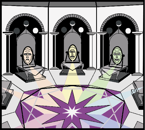 Así digo tu nombre el Templo se oscurece y tu conciencia de los otros participantes desapareced. Repentinamente un rayo de brillante luz solar desciende directamente arriba de ti y golpea la corona de tu cabeza. Esta luz pasa abajo por dentro de ti, luego una ráfaga sale del centro de tu corazón con nueve diferentes rayos coloreados. Cada uno de estos rayos alcanza y golpea a cada uno de los nueve oscuros espejos, iluminándolos con toda tu propia reflexión
