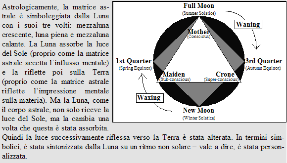 La Luna fisica condivide una risonanza essenziale (non conosco altri modi per dirlo) con la personalità umana e con la matrice astrale di tutte le cose fisiche. Le sue fasi e i suoi aspetti con gli altri pianeti influenzano direttamente le nostre vite. Molto spesso sentiamo a livello emotivo il suo tocco mentre essa decide il tono delle nostre risposte agli avvenimenti della vita.