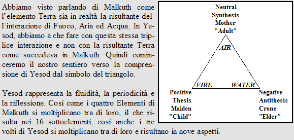 Nel Tempio di Yesod, vi consiglio di supportare gli sforzi per forgiare voi stessi visualizzando degli strumenti appropriatamente simbolici. Per esempio, quando io lavoro nel forgiarmi da solo la mia personalità in Yesod, visualizzo un trono posto nel centro esatto del Tempio. Mi siedo sul trono e pronuncio il mio nome. Mentre il raggio di sole scende su di me, ne accetto un controllo consapevole. Poi giro il mio trono (che è qualcosa tipo le poltrone con le rotelle, quelle in modello "pigrone", per intenderci ) verso uno specchio (un aspetto) a mia scelta ed emetto consapevolmente il raggio di luce che emerge dal mio cuore. Guardo il mio riflesso, mi chiedo quanto chiaramente esso rifletta la luce che riceve, e decido in che modi desidero cambiarlo. Visualizzo questi cambiamenti che si verificano e prendo nota con molta, molta attenzione di quali azioni sono necessarie affinché questi cambiamenti si manifestino nella mia vita di tutti i giorni.