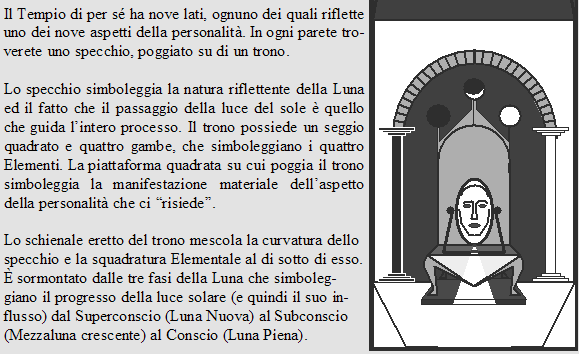 Mentre pronuncerete il vostro nome, il Tempio si oscurerà e la vostra consapevolezza della presenza degli altri partecipanti scomparirà. All'improvviso, un raggio di brillante luce solare scenderà da un punto direttamente sopra di voi e colpirà la "corona" della vostra testa (la sua sommità, il 7° chakra per chi ha familiarità con il concetto di chakram). Passerà attraverso di voi, scendendo, poi esploderà verso l'esterno partendo dal vostro cuore come nove raggi luminosi dai colori diversi. Ognuno di questi raggi raggiungerà e colpirà uno dei nove specchi oscurati, illuminandoli tutti e mostrando il vostro riflesso (o meglio: i vostri riflessi).