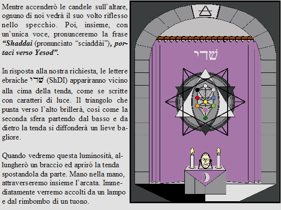 Al momento appropriato, attirerò di nuovo la vostra attenzione e poi lasceremo le mani che stiamo tenendo. Dirigerò quindi ognuno (individualmente, uno per volta) verso il centro stesso del Tempio di Yesod e vi chiederò di pronunciare ad alta voce il vostro nome [N.B. questo succederà individualmente e simultaneamente per ognuno di voi, così non dovrete visualizzare voi stessi mentre fare la coda, aspettate il vostro turno, ecc. ecc. ]