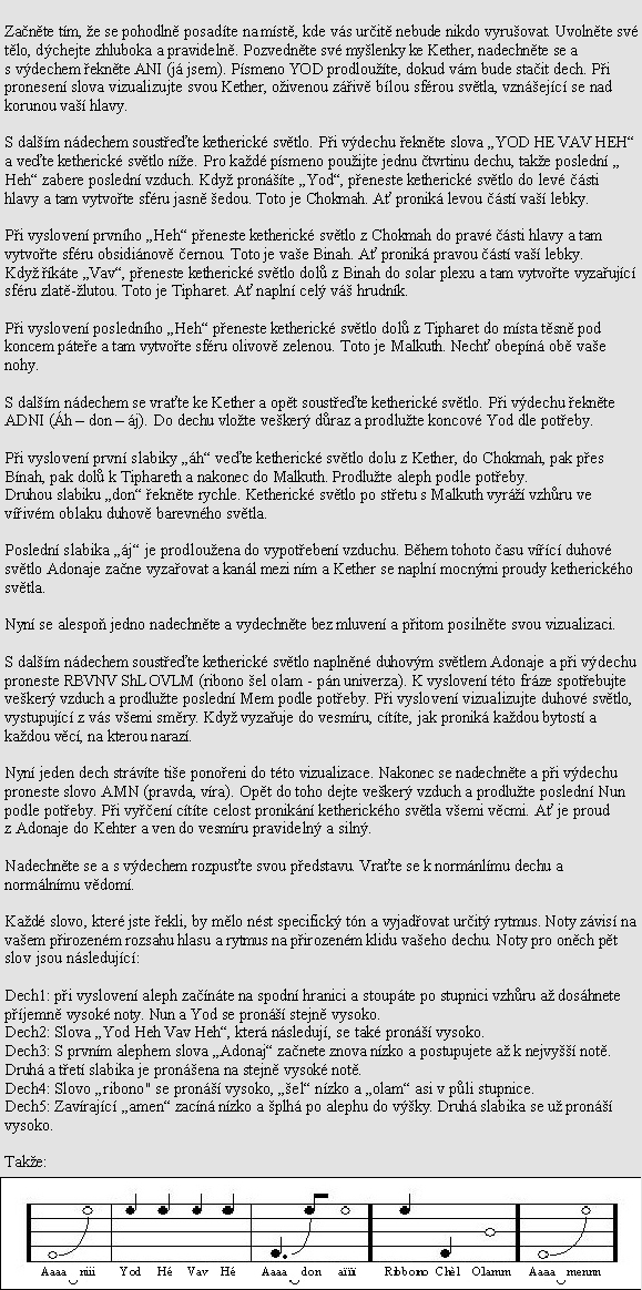 Provádejte toto cvicení denne, dokud se s ním úplne nes~ijete a nebudete ho provádet bez obtí~í. Toto cvicení uvede eventuálne vaae mentální a astrální telo do shody pri vizualizaci IHVH-ADNI struktury. Ka~dá sféra a úroven ketherického svetla mezi nimi se stane aktuálním aspektem vaaich jemnejaích tel.